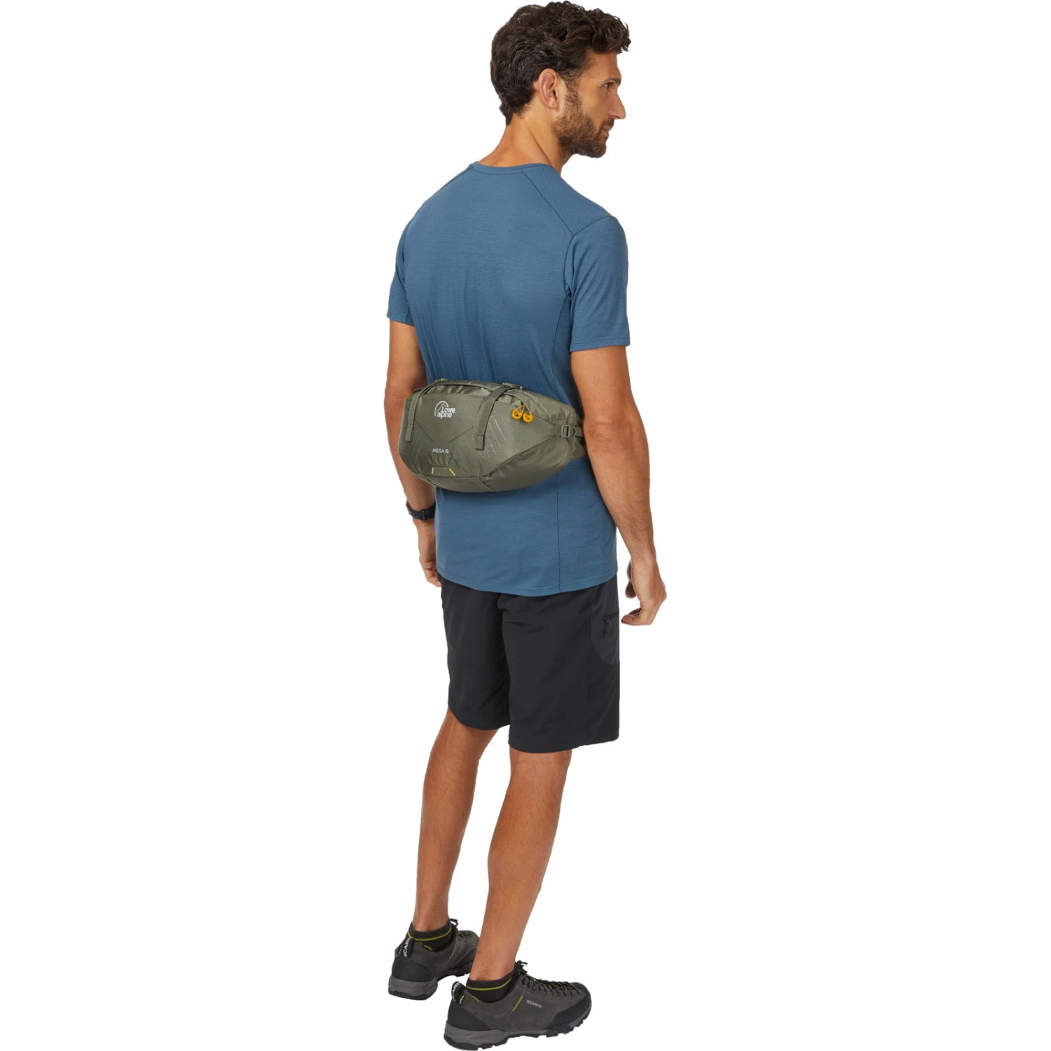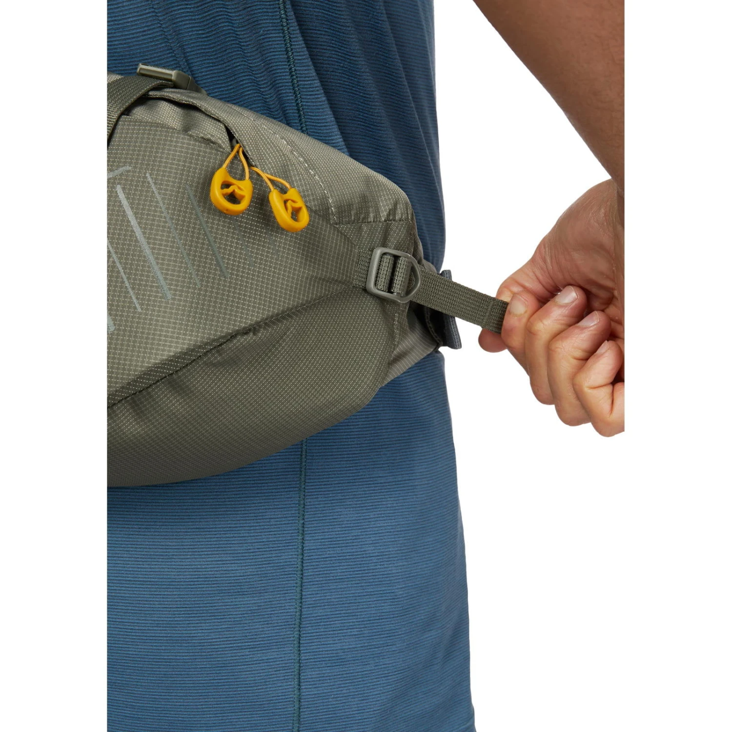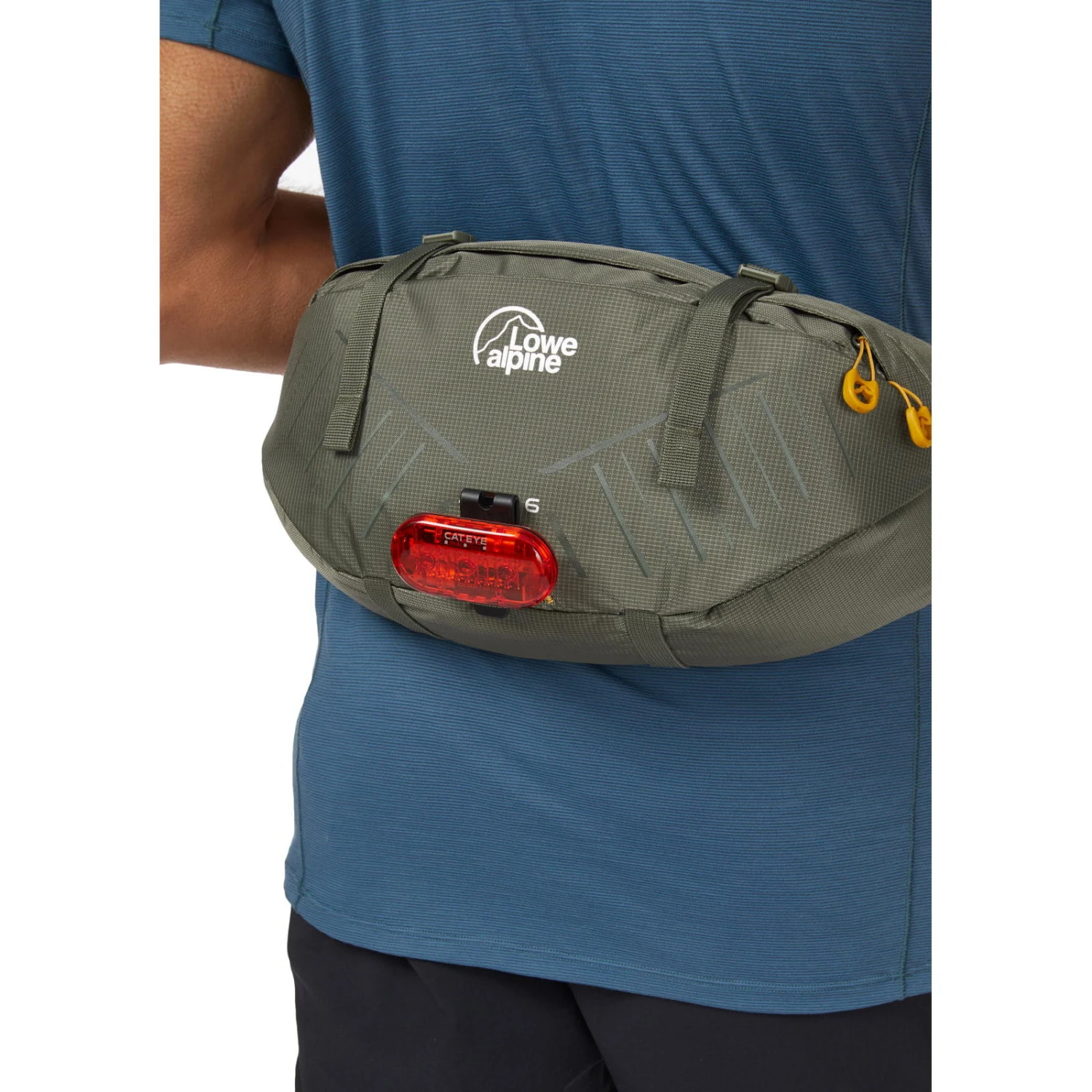 Die Mesa 6 von Lowe Alpine ist eine Hüfftasche mit einem Fassungsvermögen von 6 Litern und eignet sich ideal zum täglichen Wandern, Laufen oder Radfahren in unterschiedlichem Gelände. Die geschwungene Form schmiegt sich an den Körper und das integrierte, beidseitig zuziehbare Kompressionsschild stabilisiert das Gepäck und reduziert das Auf- und Abfedern. Die stark belüftete Air Contour™ Polsterung im Lendenwirbelbereich liegt eng an und ist von offenem Netzmaterial umgeben, das für ausreichende Luftzirkulation sorgt und gleichzeitig die Schweißansammlung reduziert, damit man kühl und trocken bleibt. Reflektierende Streifen sorgen für eine gute Sichtbarkeit und wem das nicht reicht, der kann an der Blinklichthalterung ein zusätzliches Licht anbringen. Im großen Hauptfach befinden sich eine Reißverschlusstasche und ein Schlüsselhalter. Die Lowe Alpine Mesa 6 bietet zusätzlich ein Reißverschlussfach vorne. Damit Langfinger kein leichtes Spiel haben, sind die Reißverschlusstaschen mit einer Abdeckung und Kompressionsriemen gesichert. Wenn man mal etwas mehr mitnehmen möchte, kann man die Riemen lockern und vorne eine Regenjacke unterbringen oder Schirm, Kamarastativ, etc. befestigen.