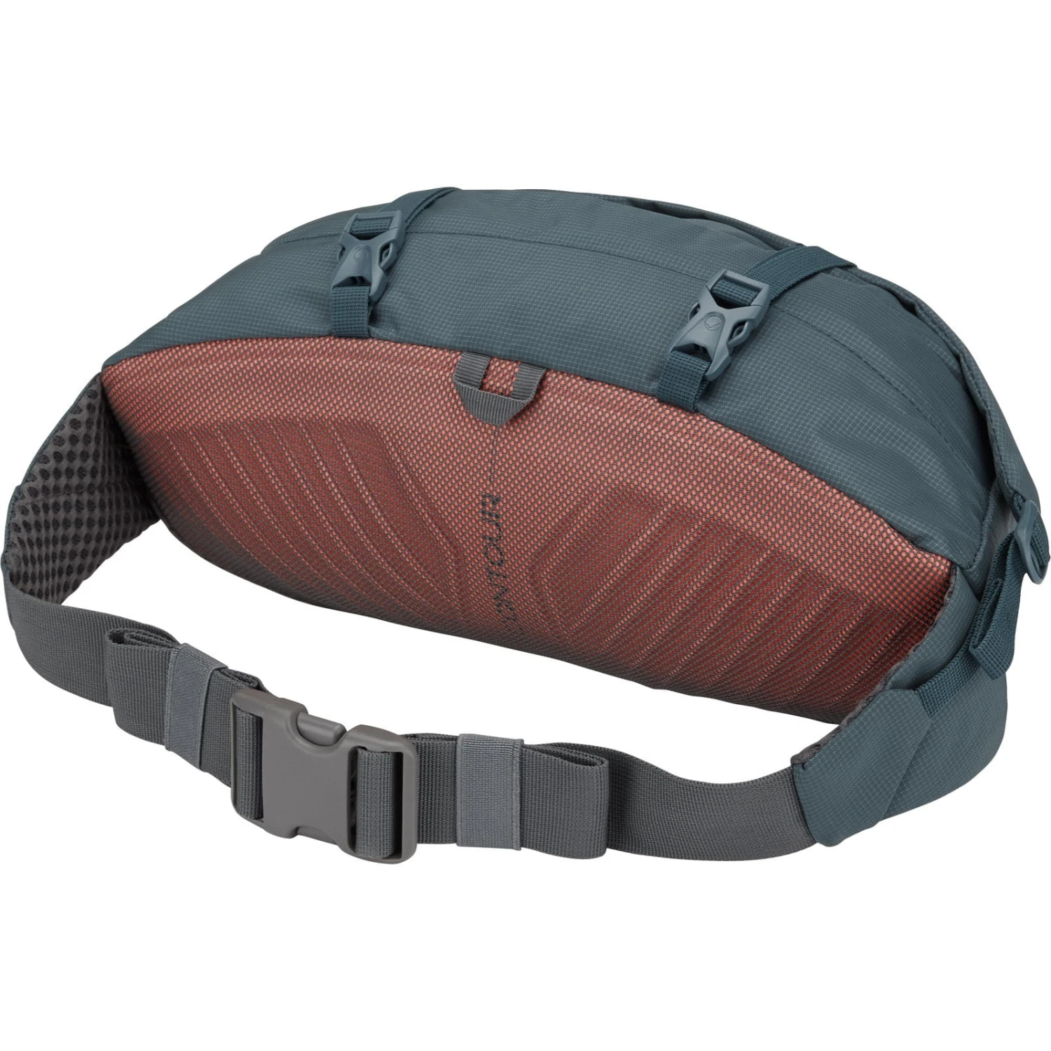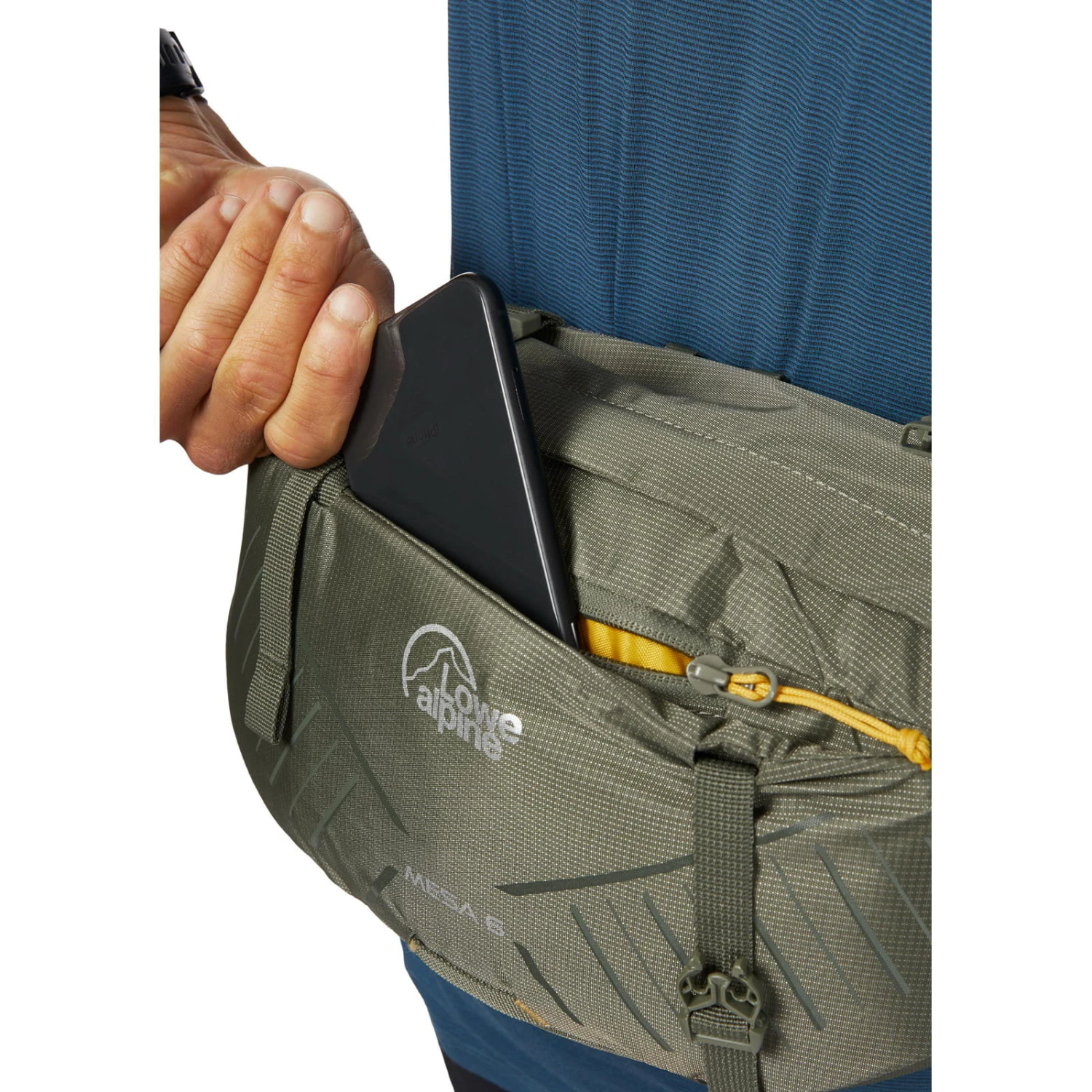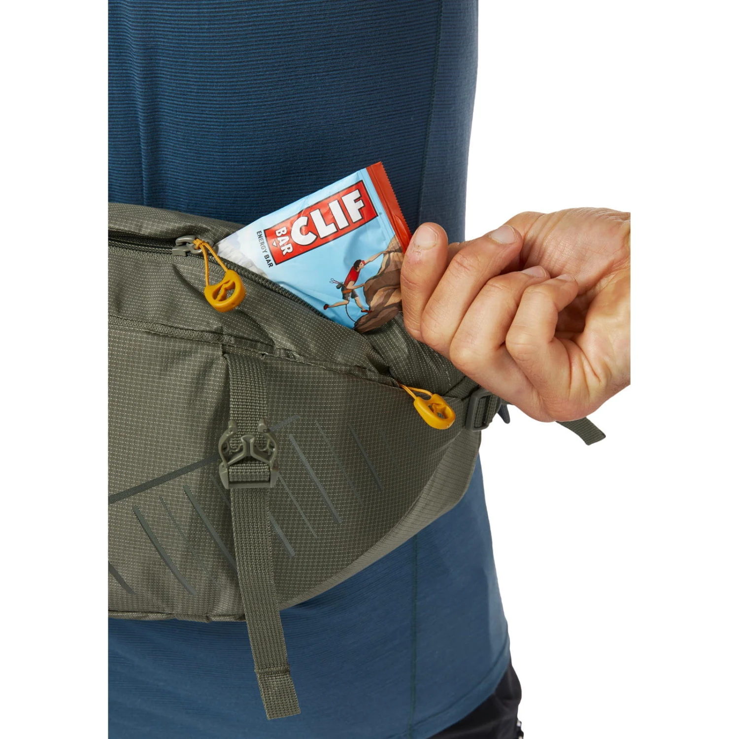 Die Mesa 6 von Lowe Alpine ist eine Hüfftasche mit einem Fassungsvermögen von 6 Litern und eignet sich ideal zum täglichen Wandern, Laufen oder Radfahren in unterschiedlichem Gelände. Die geschwungene Form schmiegt sich an den Körper und das integrierte, beidseitig zuziehbare Kompressionsschild stabilisiert das Gepäck und reduziert das Auf- und Abfedern. Die stark belüftete Air Contour™ Polsterung im Lendenwirbelbereich liegt eng an und ist von offenem Netzmaterial umgeben, das für ausreichende Luftzirkulation sorgt und gleichzeitig die Schweißansammlung reduziert, damit man kühl und trocken bleibt. Reflektierende Streifen sorgen für eine gute Sichtbarkeit und wem das nicht reicht, der kann an der Blinklichthalterung ein zusätzliches Licht anbringen. Im großen Hauptfach befinden sich eine Reißverschlusstasche und ein Schlüsselhalter. Die Lowe Alpine Mesa 6 bietet zusätzlich ein Reißverschlussfach vorne. Damit Langfinger kein leichtes Spiel haben, sind die Reißverschlusstaschen mit einer Abdeckung und Kompressionsriemen gesichert. Wenn man mal etwas mehr mitnehmen möchte, kann man die Riemen lockern und vorne eine Regenjacke unterbringen oder Schirm, Kamarastativ, etc. befestigen.