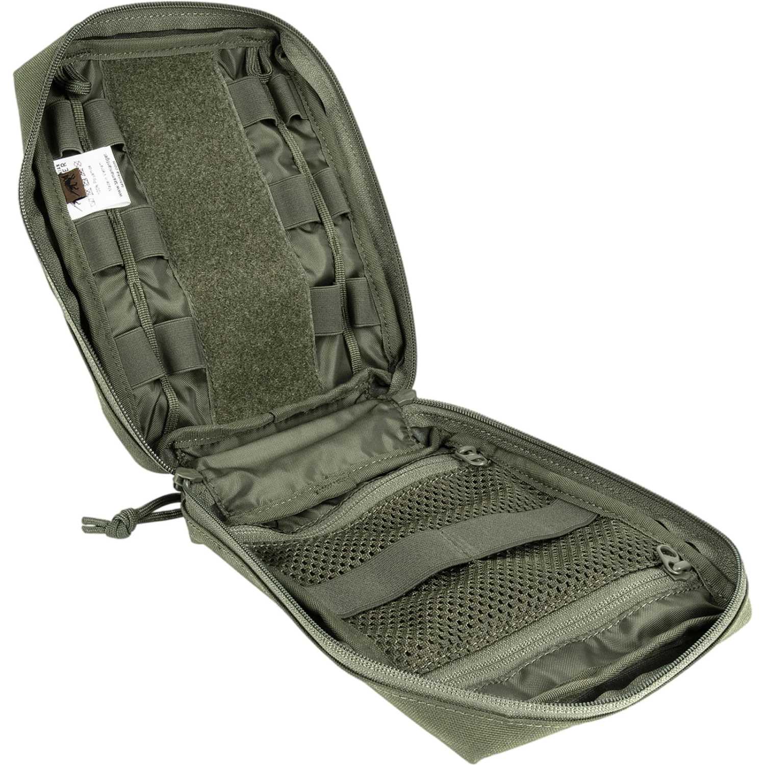Zubehörtasche mit den Außenmaßen 20 x 15 x 6 cm, einer großen Öffnung und MOLLE-Reverse-System. Innen befinden sich MOLLE-Klett, eine Netztasche sowie elastische Schlaufen.