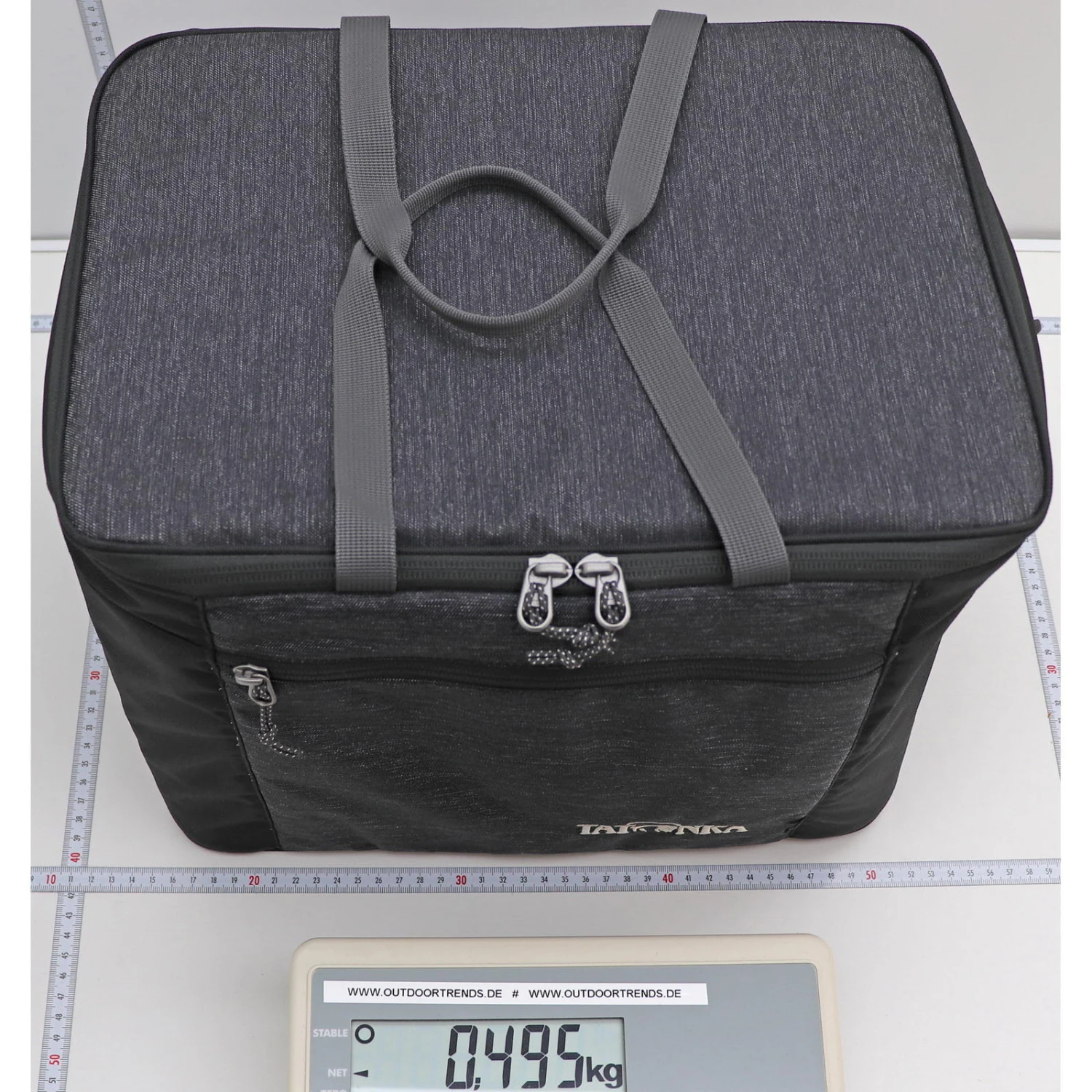 Kühltasche mit 25 Liter Volumen. Die praktische Kühltasche Cooler Bag L von Tatonka mit den Maßen 37 x 27 x 30 cm (außen) ist mit Handgriffen und Tragegurt ausgestattet. Der Deckel lässt sich zum leichten Beladen komplett aufziehen, ein separates Fach an der Seite nimmt die Kühlelemente auf. Das flache Reißverschlussfach auf der Front kann zum Beispiel zur Unterbringung von Besteck oder Servietten genutzt werden.